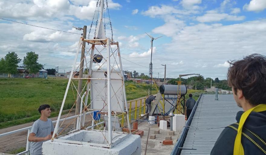 El primer aerogenerador instalado en 2024 permitió iluminar sectores del edificio mediante una red interna de 12 V.