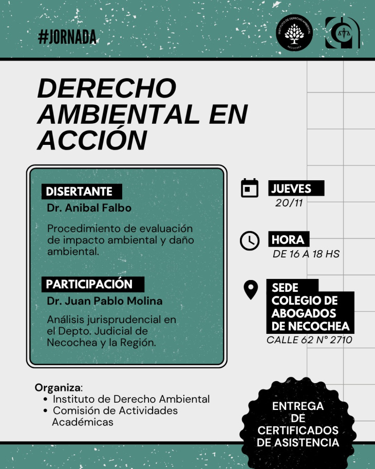 La actividad contará con la presencia del Dr. Aníbal Falbo, referente nacional en Derecho Ambiental, quien abordará temas claves como el acceso a la justicia ambiental, el procedimiento de impacto ambiental y el daño ambiental. La apertura estará a cargo del Instituto, seguida por una exposición de casos locales a cargo del abogado necochense Juan Pablo Molina.