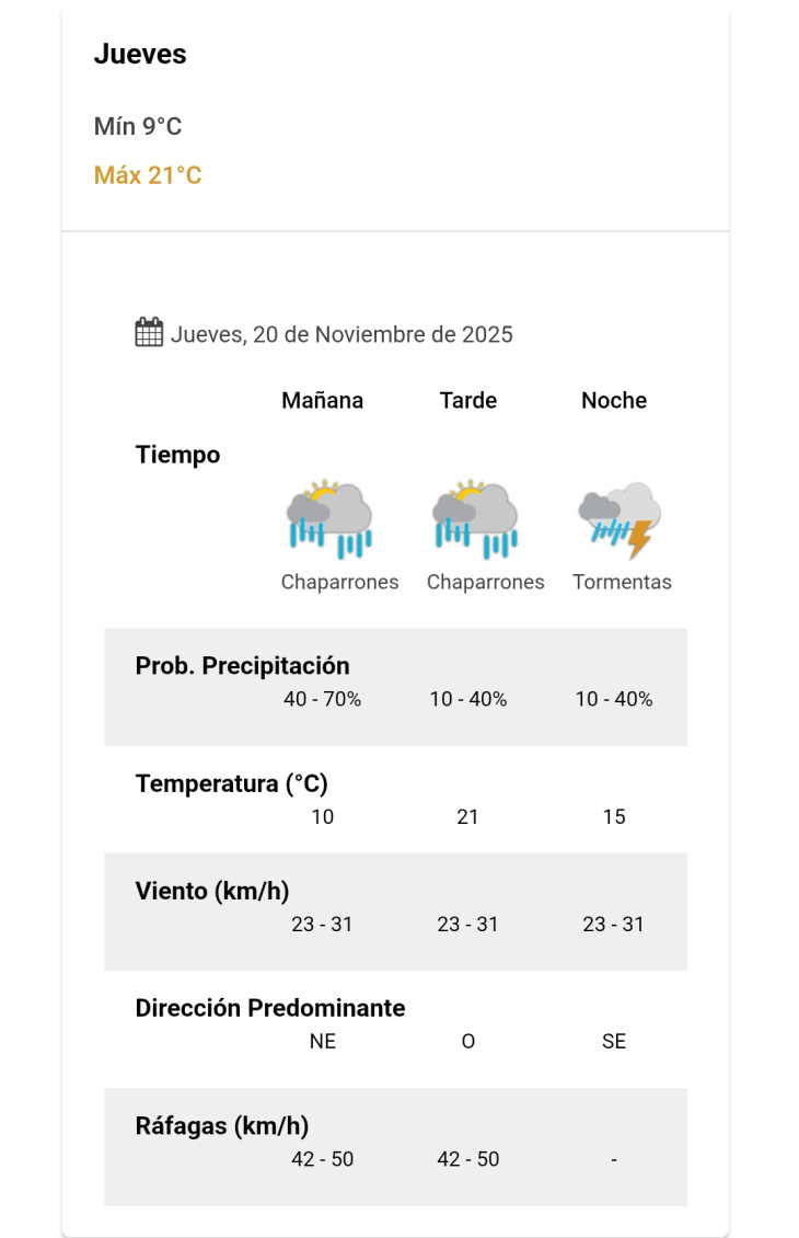 Por la tarde, la lluvia continuará de forma más ligera, con probabilidad de 10 a 40%, mientras la máxima alcanzará los 21 °C. El viento cambiará ligeramente su dirección hacia el oeste, manteniendo ráfagas similares.