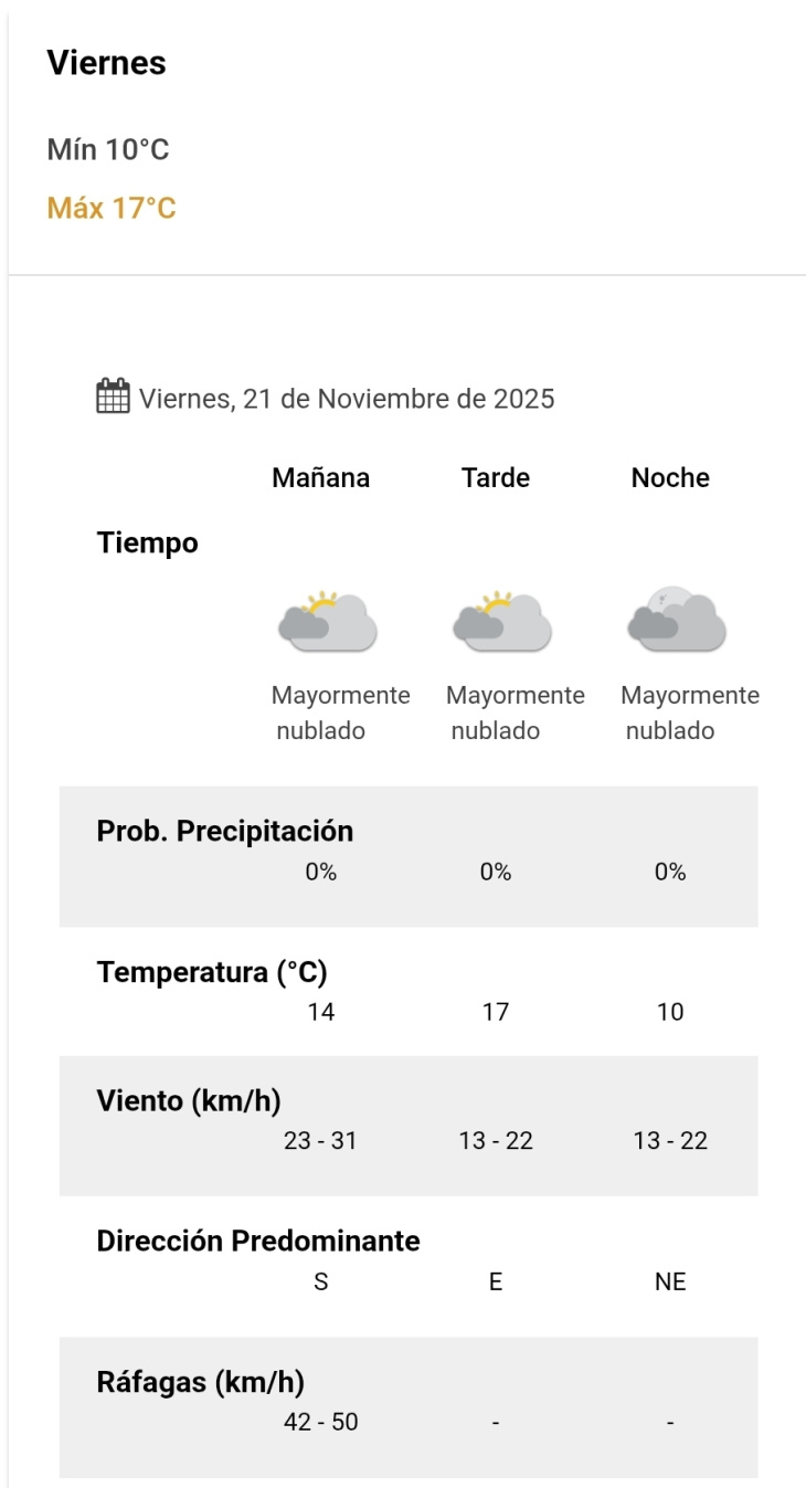 La humedad rondará el 80%, y la presión atmosférica será de 1012,6 hPa, generando una sensación térmica fresca durante la jornada. Se recomienda precaución por las ráfagas matutinas, especialmente para quienes circulen en vehículos livianos o a pie.