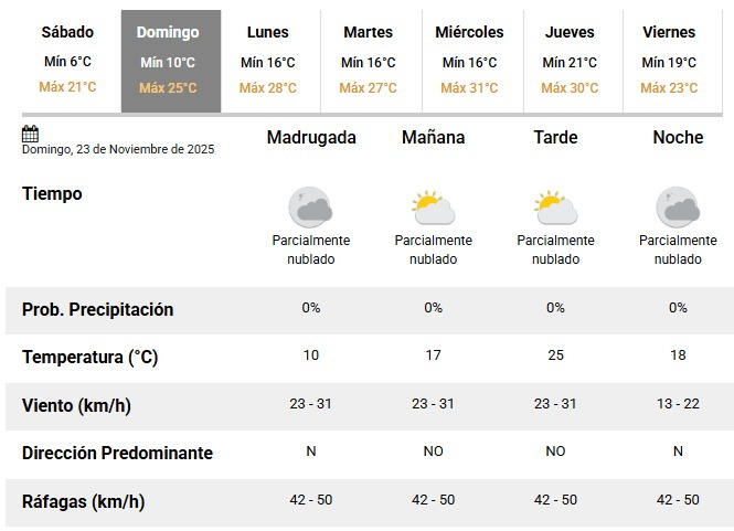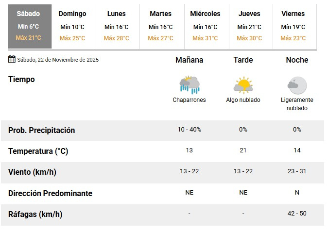 El sábado 22 de noviembre de 2025, el cielo estuvo algo nublado durante la mañana, con apenas probabilidad de lluvias aisladas que no se registraron. Por la tarde continuará algo nublado, mientras que hacia la noche se espera un panorama ligeramente despejado. Las temperaturas oscilarán entre 13 °C de mínima y 21 °C de máxima. Los vientos soplarán desde el noreste a 13-22 km/h, aumentando hacia la noche hasta 23-31 km/h, con ráfagas de 42-50 km/h. La humedad se mantendrá en 58% y la presión en 1021,7 hPa.