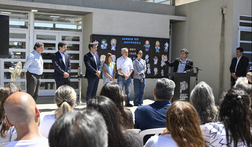 “Este jardín lo plantó Vidal y quedó abandonado. Hoy estamos inaugurando sin haber prometido nada: 292 edificios escolares, 500 edificios reconstruidos y 1.300 aulas anexas, equivalentes a 1.000 escuelas nuevas en la Provincia de Buenos Aires.”