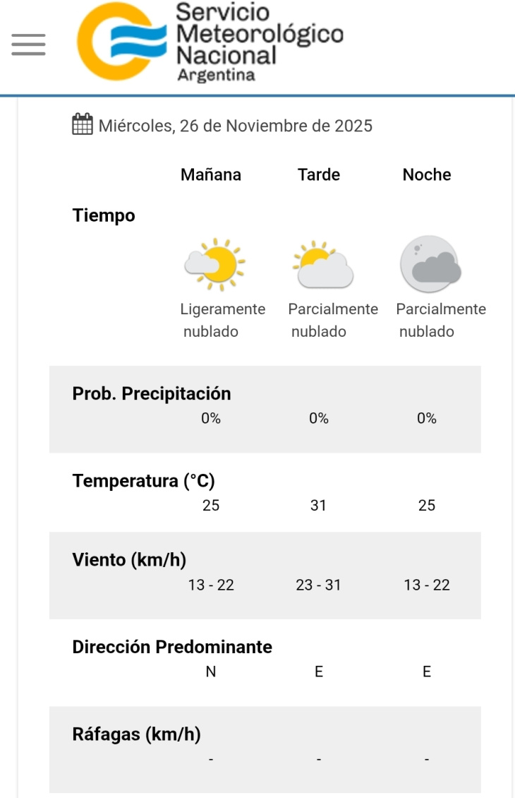 Durante la mañana, el cielo se mantendrá ligeramente nublado, con vientos del Norte entre 13 y 22 km/h y una temperatura cercana a los 25°C.