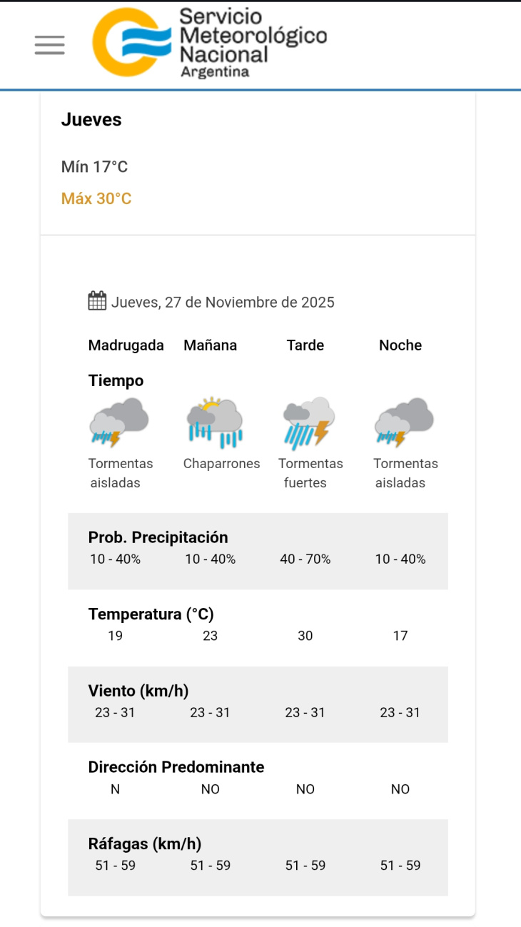 Noche: tormentas aisladas, probabilidad del 10% al 40%, temperatura mínima de 17°C, y vientos del NO con ráfagas entre 51 y 59 km/h.
