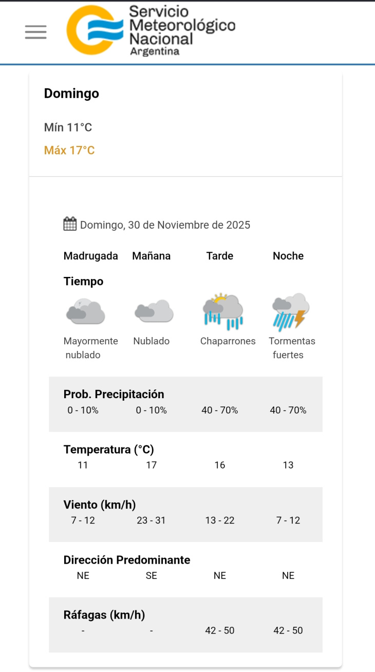 La tarde marcará el inicio del desmejoramiento, con chaparrones y una probabilidad de precipitación que oscilará entre el 40% y 70%. La temperatura será de 16°C, con vientos del NE de 13 a 22 km/h y ráfagas que podrán llegar a los 50 km/h.