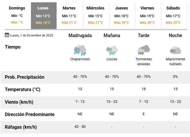 Madrugada: del noreste (NE) entre 7 y 12 km/h, con ráfagas de 42 a 50 km/h.