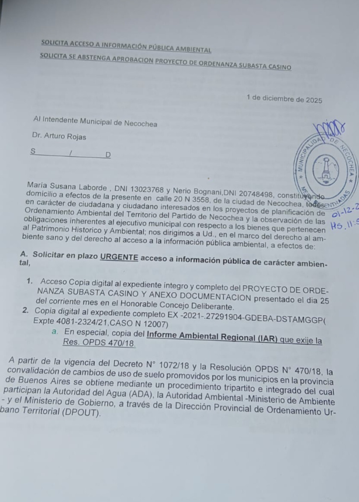 La solicitud, firmada por María Susana Laborde y Nerio Bognani, exige el Informe Ambiental Regional (IAR), previsto por la Resolución OPDS 470/18 y el procedimiento IPAR-CUS, que permite evaluar los impactos ambientales de incidencia regional derivados de un cambio de uso del suelo. A diferencia del Estudio de Impacto Ambiental, el IAR analiza los efectos acumulativos y sinérgicos sobre el territorio, asegurando que las decisiones municipales respeten la sustentabilidad ambiental.