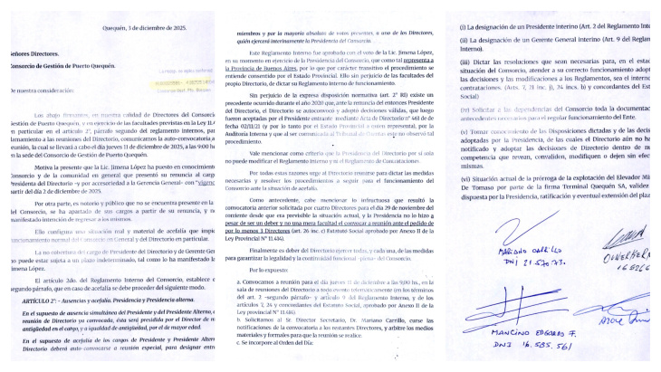 En el plano local, la Asamblea por la Soberanía de Puerto Quequén expresó críticas al procedimiento. Su referente, Mario Dahul, sostuvo que una autoconvocatoria para designar autoridades no estaría contemplada para este tipo de situaciones y que la iniciativa carecería de sustento interno. Afirmó que la maniobra configuraría “un intento de avanzar sobre una competencia que corresponde exclusivamente a la Provincia”, y advirtió sobre los efectos que decisiones institucionales de esta magnitud pueden tener sobre concesiones y procesos económicos de largo plazo.