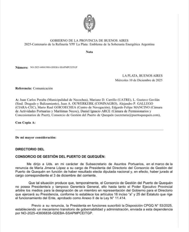 El Gobierno de la provincia de Buenos Aires envió una comunicación formal al Directorio del Consorcio de Gestión de Puerto Quequén, luego de la renuncia de Jimena López, quien dejó la Presidencia del Ente tras asumir como diputada nacional. En el documento, firmado por el Subsecretario de Asuntos Portuarios, se informa que la salida de López genera que “el Consorcio de Gestión del Puerto de Quequén no posea Presidente/a y tampoco Gerente/a General”, situación que se mantendrá “hasta tanto el Poder Ejecutivo Provincial arbitre los medios para la designación de un miembro en representación del Gobierno para el Directorio que ejercerá su Presidencia”.