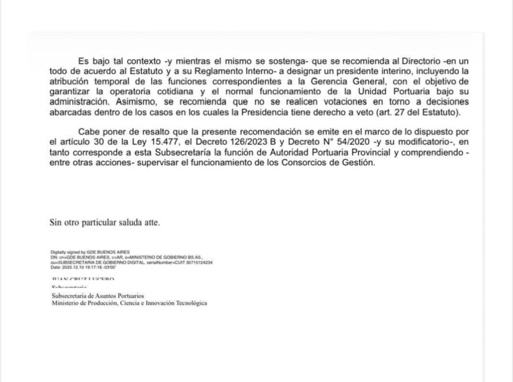 Uno de los ejes centrales de la nota es la recomendación del Gobierno bonaerense de avanzar en la designación de una conducción provisoria. En ese sentido, la Subsecretaría indica que “se recomienda al Directorio […] designar un presidente interino, incluyendo la atribución temporal de las funciones correspondientes a la Gerencia General, con el objetivo de garantizar la operatoria cotidiana y el normal funcionamiento de la Unidad Portuaria bajo su administración”.