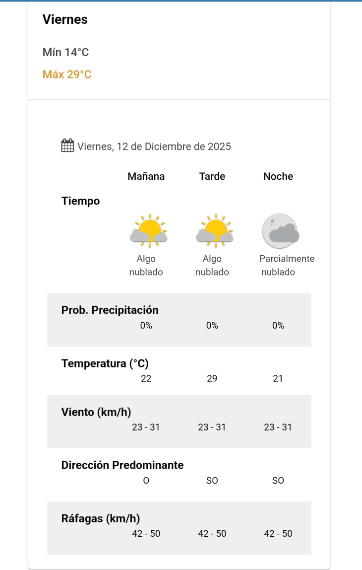 En horas de la tarde, se mantendrán condiciones similares, con cielo algo nublado, una temperatura máxima de 29 grados y viento del sudoeste, acompañado por ráfagas que podrían alcanzar entre 42 y 50 km/h.