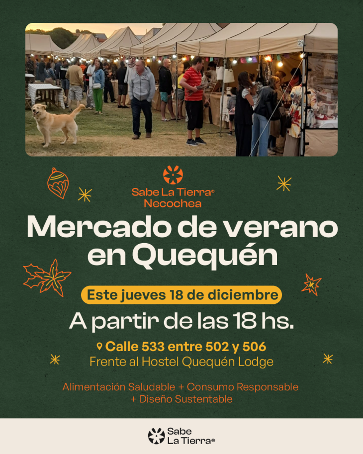 La principal novedad de esta temporada se dará en Quequén, donde Sabe la Tierra desembarca con un mercado nocturno durante el mes de diciembre. Las fechas confirmadas son jueves 18, martes 23 y martes 30 de diciembre, siempre a partir de las 18 horas, en calle 533 entre 502 y 506, frente al Hostel Quequén Lodge.