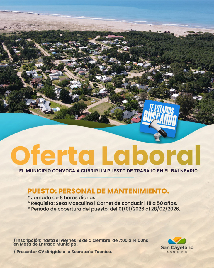 En paralelo, el Municipio de San Cayetano informó que se encuentra abierta la inscripción para cubrir un puesto de personal de mantenimiento en el Balneario San Cayetano, con una jornada de 8 horas diarias. El período de contratación será del 1 de enero al 28 de febrero de 2026, y los requisitos incluyen contar con carnet de conducir y tener entre 18 y 50 años. Los interesados deberán presentar currículum vitae dirigido a la Secretaría Técnica en Mesa de Entrada Municipal, de 7 a 14 horas, con plazo de inscripción hasta el 19 de diciembre.