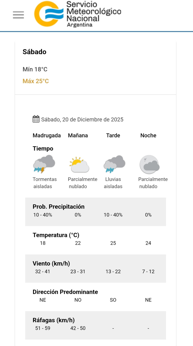 En horas de la tarde, volverá la inestabilidad con lluvias aisladas y una temperatura máxima prevista de 25 grados. El viento disminuirá su intensidad, soplando del sudoeste a 13–22 km/h, mientras que la probabilidad de precipitaciones volverá a ubicarse entre el 10 y el 40 %.