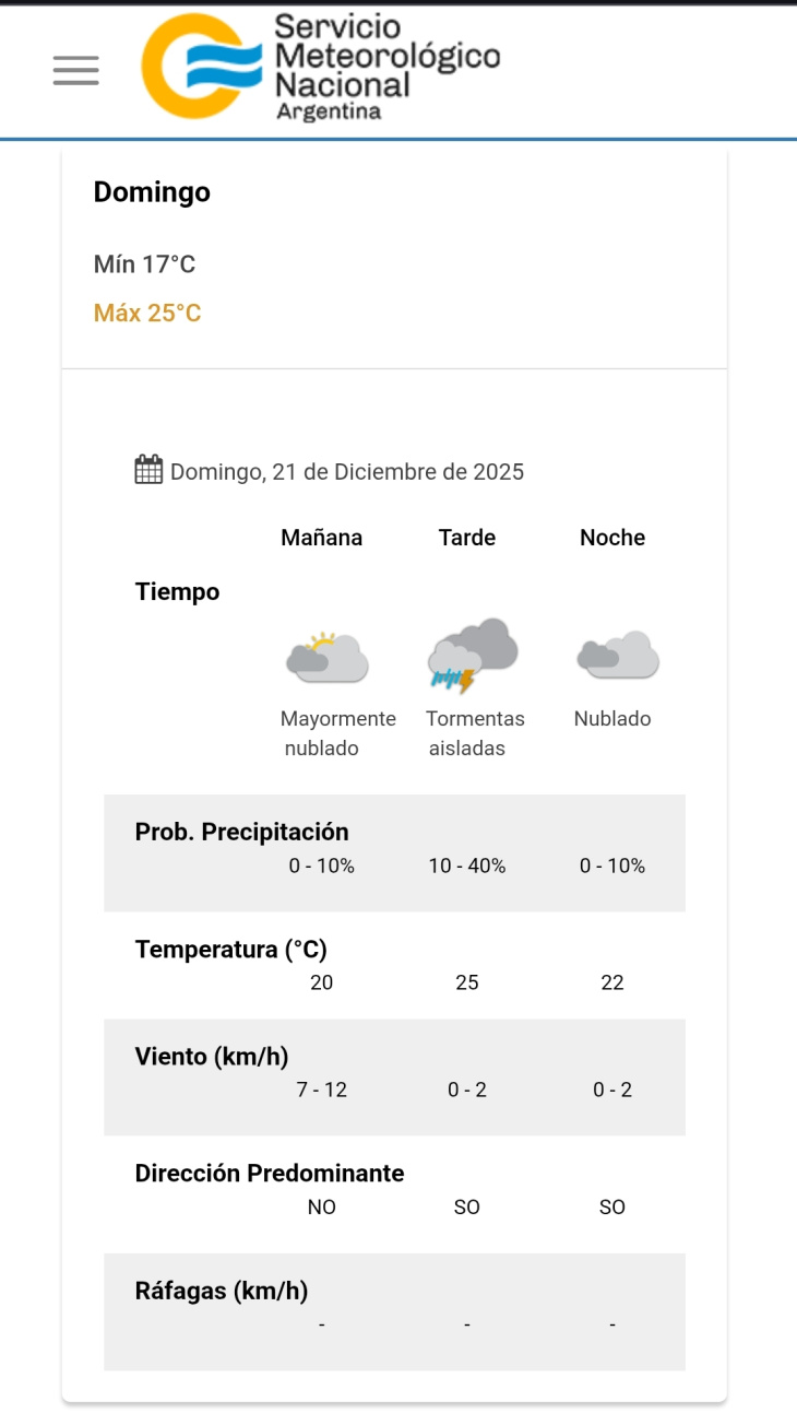La temperatura máxima alcanzará los 25°C, mientras que los vientos rotarán al Sudoeste, con intensidad leve (0 a 2 km/h).