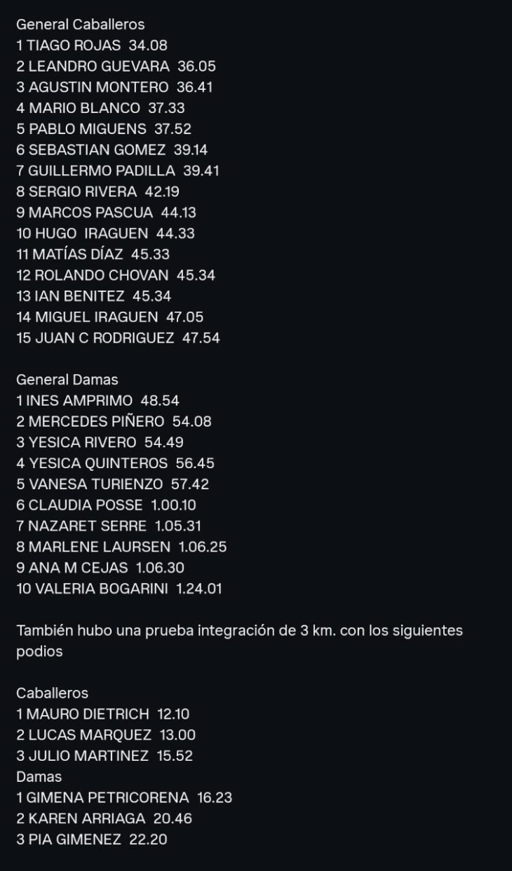En los 10K, el mejor tiempo de la jornada fue registrado por Tiago Rojas, atleta de la Escuela Municipal de Atletismo, quien cruzó primero el arco de llegada con un tiempo de 34 minutos y 08 segundos, imponiendo su ritmo desde los primeros kilómetros. El segundo puesto de la clasificación general quedó para Leandro Guevara, con 36:08, mientras que el tercer lugar fue ocupado por Agustín Montero, también integrante de la Escuela Municipal de Atletismo que coordina el profesor Mauro Cabrera, con un registro de 36:41.