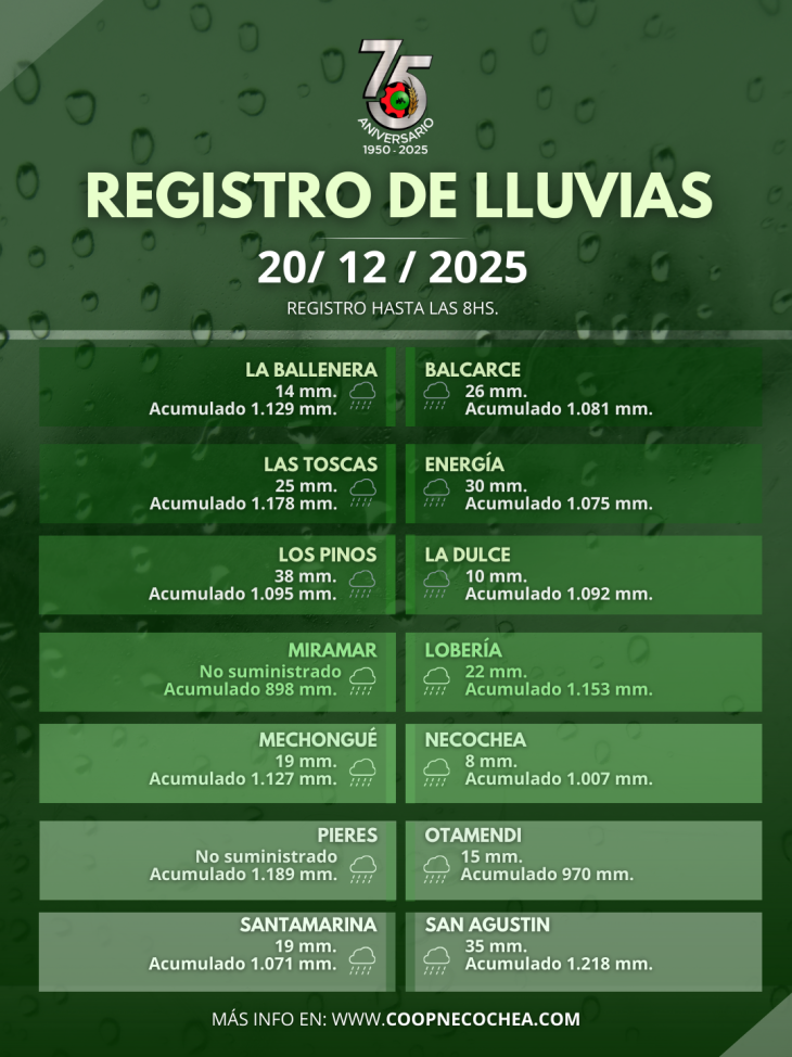 El temporal tuvo un impacto extendido en el sudeste bonaerense, con registros significativamente más elevados en zonas rurales y localidades cercanas. Entre los valores más destacados de la jornada del 20 de diciembre se ubicaron Los Pinos con 38 mm y San Agustín con 35 mm. También se reportaron 26 mm en Balcarce, 25 mm en Las Toscas, 19 mm en Mechongué, 15 mm en Otamendi y 14 mm en La Ballenera. A estos valores se sumaron 10 mm en La Dulce, 19 mm en Santamarina, 22 mm en Lobería y 30 mm en Energía.