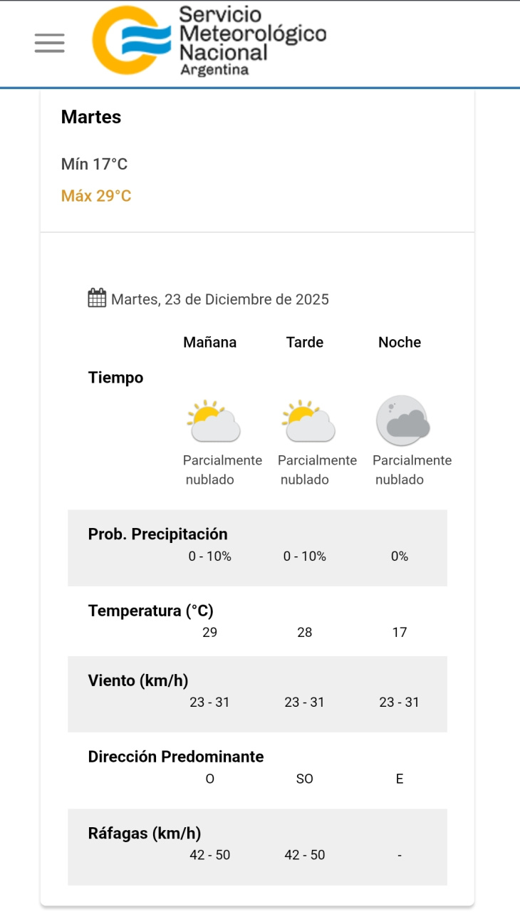 Durante la mañana, la temperatura alcanzará los 29°C, con viento del sector oeste entre 23 y 31 km/h, acompañado por ráfagas que podrían ubicarse entre 42 y 50 km/h. La probabilidad de lluvias será baja, entre 0 y 10%.