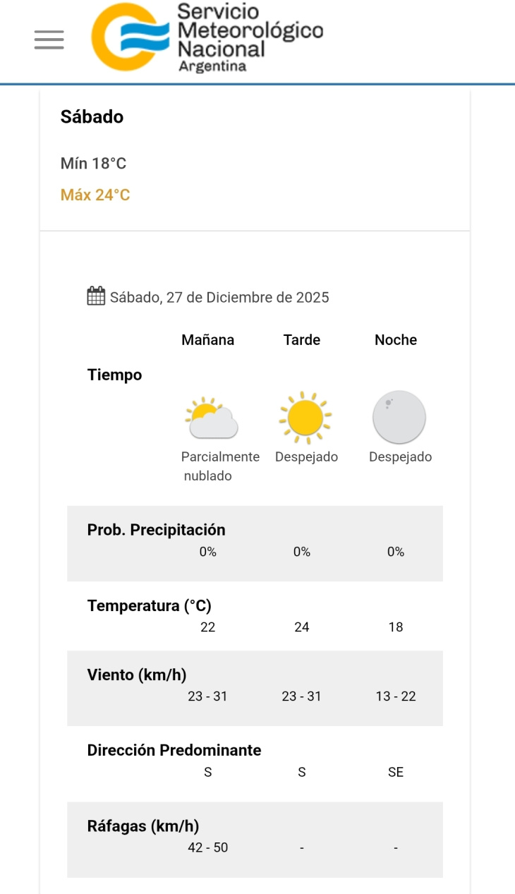 💨 Viento: del sector sur, entre 23 y 31 km/h