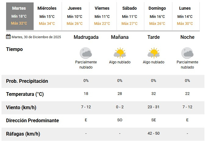 Durante la madrugada, el cielo estará parcialmente nublado, con una temperatura mínima cercana a los 18 grados. El viento soplará leve desde el este, con velocidades estimadas entre 7 y 12 km/h, sin probabilidad de precipitaciones.