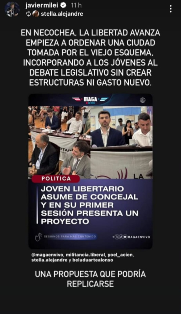 La iniciativa fue destacada por el medio digital MAGA en Vivo, que remarcó que se trató de la primera sesión del concejal y subrayó el objetivo de ampliar la participación juvenil dentro del ámbito legislativo local. Ese contenido fue posteriormente replicado por la usuaria stella.alejandre, quien etiquetó al presidente Milei, logrando que el mandatario nacional lo compartiera en sus historias el 1° de enero.