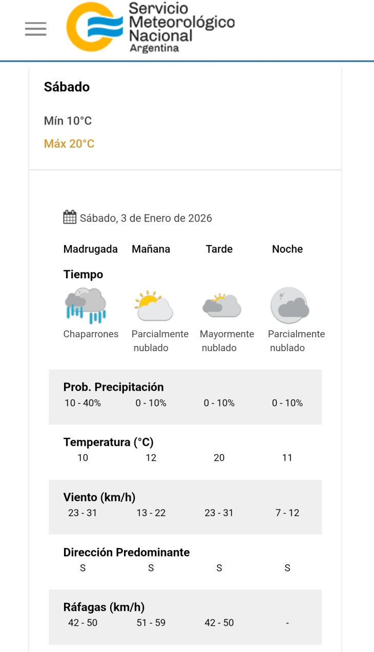 Durante la madrugada se esperan chaparrones aislados, con una probabilidad de precipitación estimada entre el 10 y el 40 %. La temperatura mínima será de 10°C, con viento del sur entre 23 y 31 km/h y ráfagas que podrían alcanzar los 50 km/h.