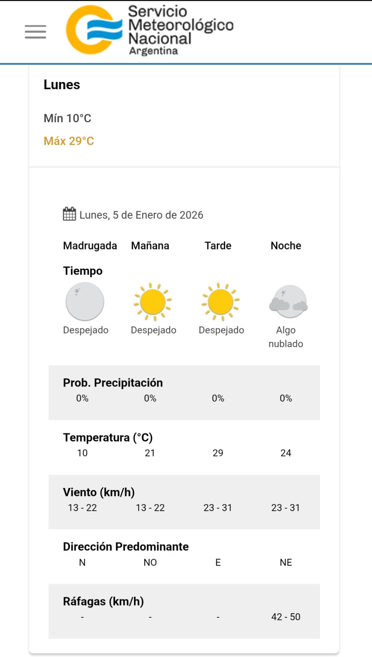 Durante la madrugada, la temperatura mínima será de 10°C, con cielo despejado y viento del norte entre 13 y 22 km/h, en un comienzo de día fresco.