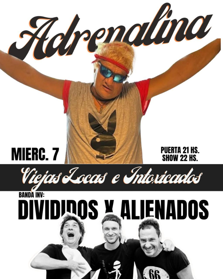 Desde Mar del Plata llega Adrenalina, banda tributo que recorre los clásicos del rock nacional asociados a la obra de Pity Álvarez. La noche contará además con la participación de Divididos x Alienados, como banda invitada.