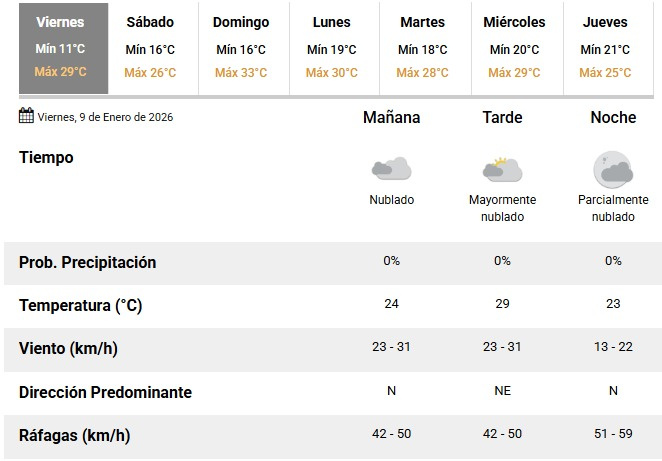 Durante la mañana, el cielo se mantendrá nublado, con una temperatura cercana a los 24°C. El viento soplará del sector norte, con velocidades estimadas entre 23 y 31 km/h y ráfagas que podrían alcanzar entre 42 y 50 km/h.