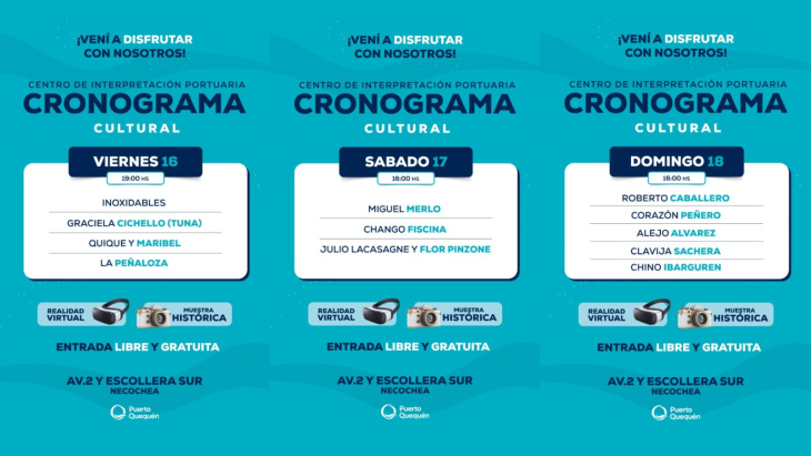 Las actividades se desarrollarán en el espacio ubicado en Avenida 2 y Escollera Sur, en la ciudad de Necochea, e incluirán espectáculos musicales, danza folclórica en vivo, una muestra histórica y experiencias de realidad virtual vinculadas al ámbito portuario.