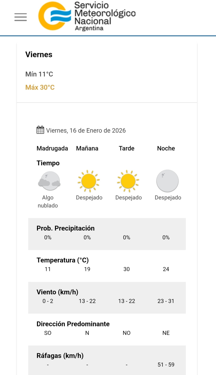 La tarde será el momento más cálido de la jornada, con cielo despejado y una temperatura máxima de 30°C. El viento rotará al noroeste, manteniéndose entre 13 y 22 km/h.