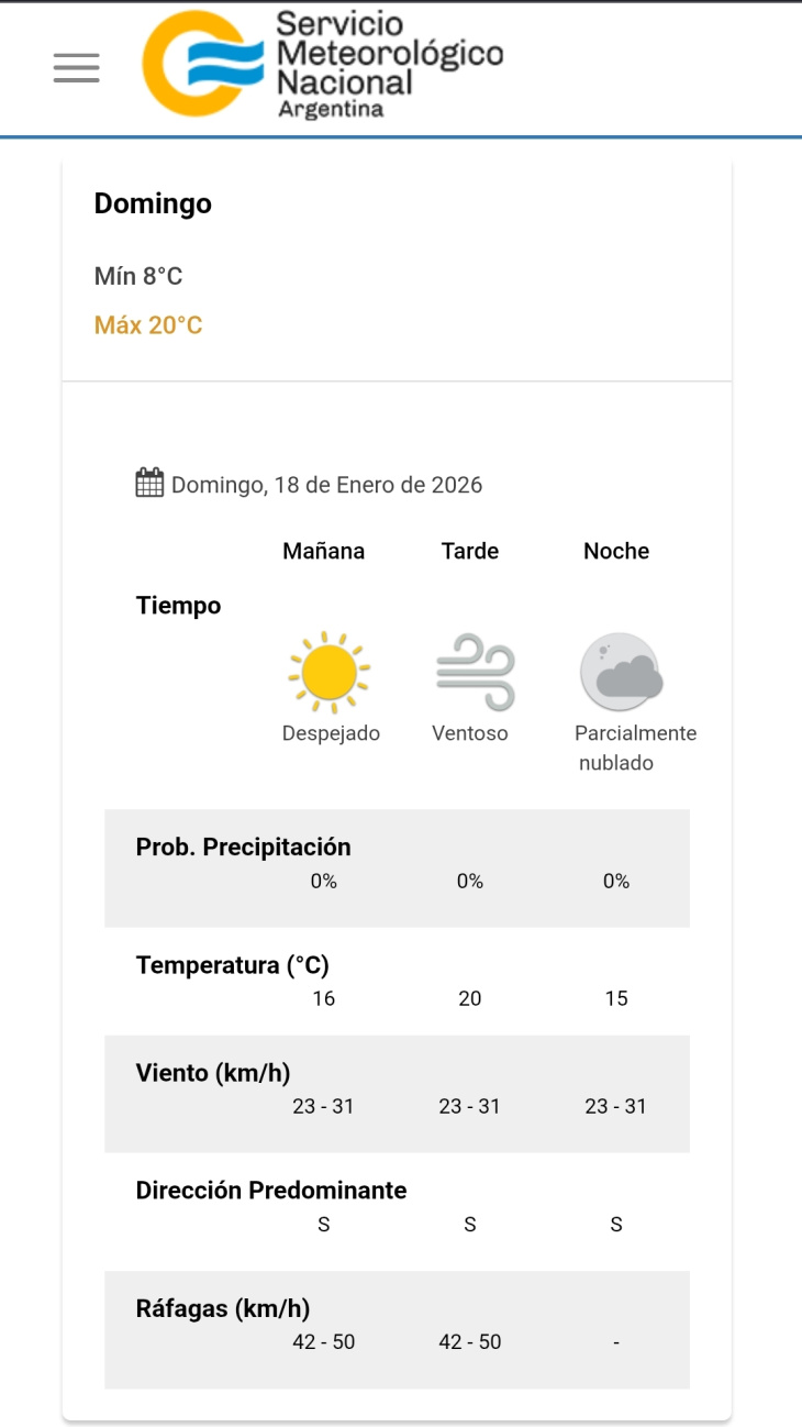 Durante la mañana, el cielo estará despejado, con una temperatura mínima cercana a los 8°C. El viento soplará del sector sur, con intensidades de entre 23 y 31 km/h, y ráfagas que podrían alcanzar los 42 a 50 km/h, especialmente en zonas abiertas y costeras.