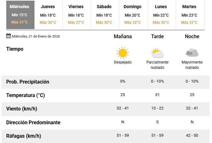 El viento volverá a predominar del norte, con velocidades de 32 a 41 km/h y ráfagas de hasta 50 km/h.