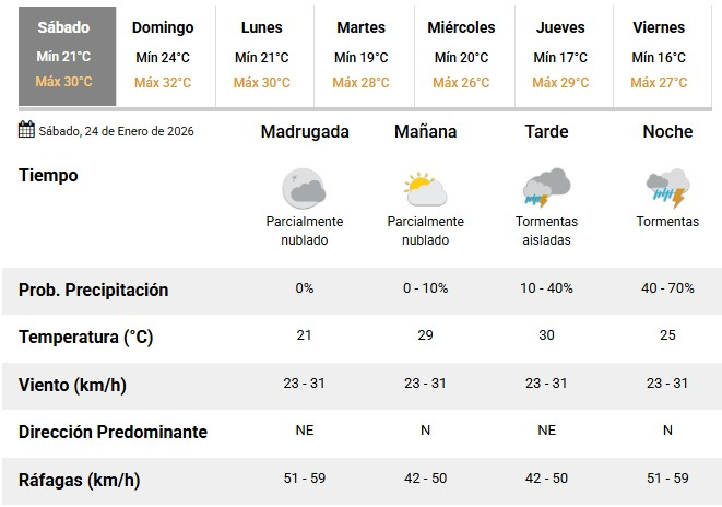 En la tarde, el calor se hará sentir con una temperatura máxima cercana a los 30°C. Se prevé la aparición de tormentas aisladas, con una probabilidad de precipitación que oscilará entre el 10 y el 40%. El viento continuará del noreste, con ráfagas que podrían alcanzar los 50 km/h.