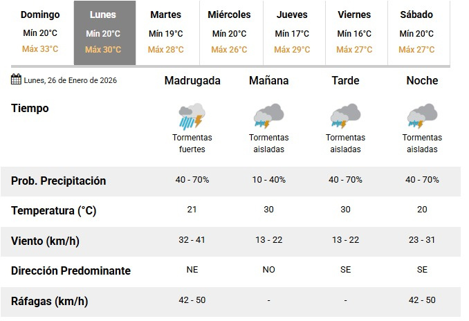 Durante la madrugada, se esperan lluvias y tormentas de intensidad fuerte, con una probabilidad de precipitación estimada entre el 40 y el 70%. El viento soplará del noreste, con velocidades de 32 a 41 km/h y ráfagas que podrían alcanzar los 50 km/h, mientras que la temperatura rondará los 21°C.