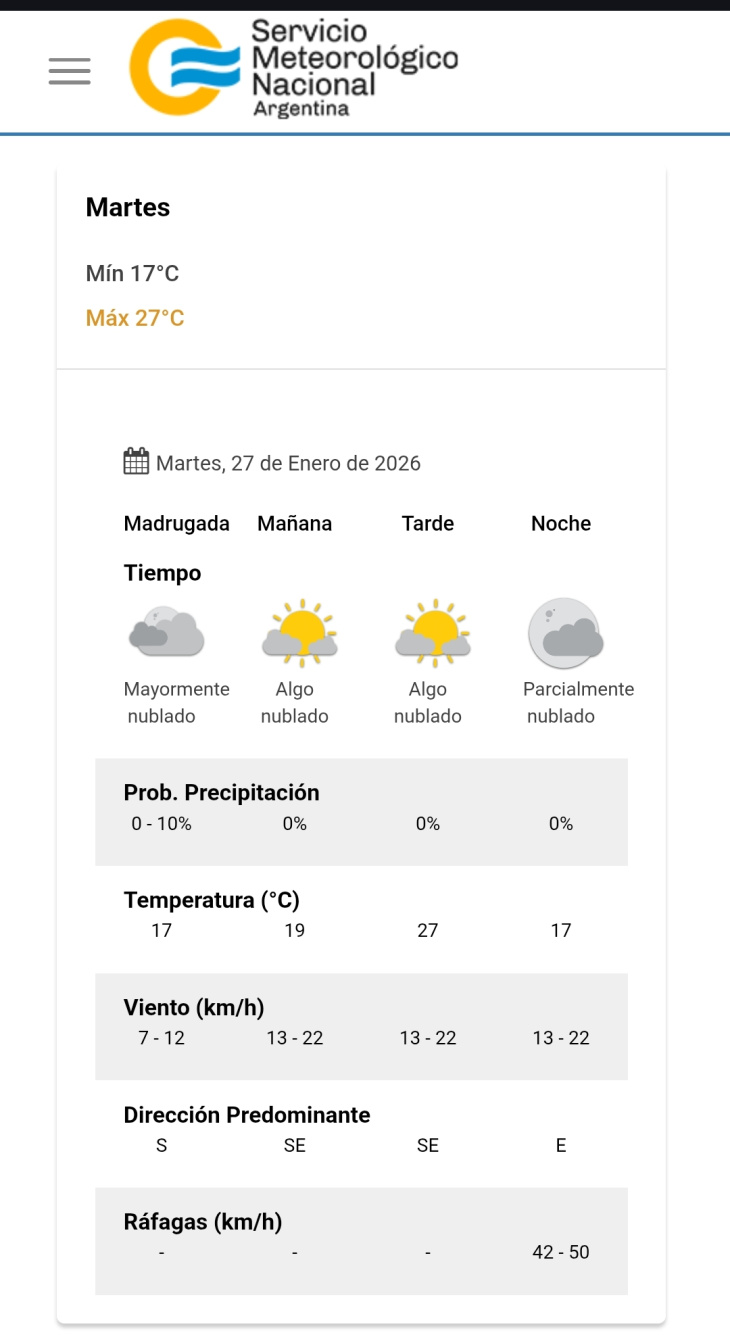 En la madrugada, la temperatura mínima será de 17°C, con viento leve del sector sur, entre 7 y 12 km/h.