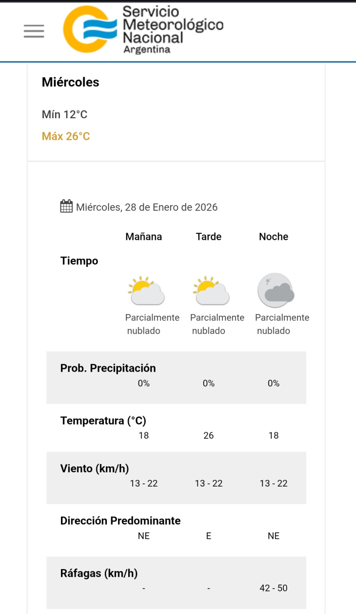 Por la noche, la temperatura descenderá nuevamente hasta los 18°C. El viento rotará al noreste y se prevén ráfagas que podrían alcanzar entre 42 y 50 km/h.