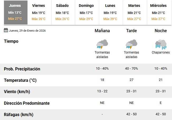 La inestabilidad se intensificará por la tarde, cuando continuarán las tormentas aisladas y la probabilidad de lluvias aumentará al 40–70%. La temperatura máxima llegará a 27°C. Los vientos soplarán del NE a velocidades de 23 a 31 km/h, con ráfagas que podrían alcanzar entre 42 y 50 km/h.