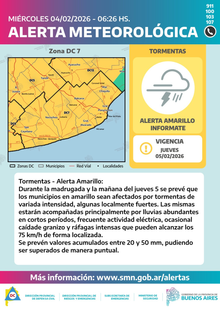 El Servicio Meteorológico Nacional emitió un alerta amarillo por tormentas el miércoles 4 de febrero a las 6:26 hs, con vigencia prevista para la madrugada y la mañana del jueves 5 de febrero en la Zona DC7. Esta zona comprende a Necochea, Quequén, San Cayetano, Lobería, Balcarce, Tandil, Benito Juárez y otras localidades de la región.