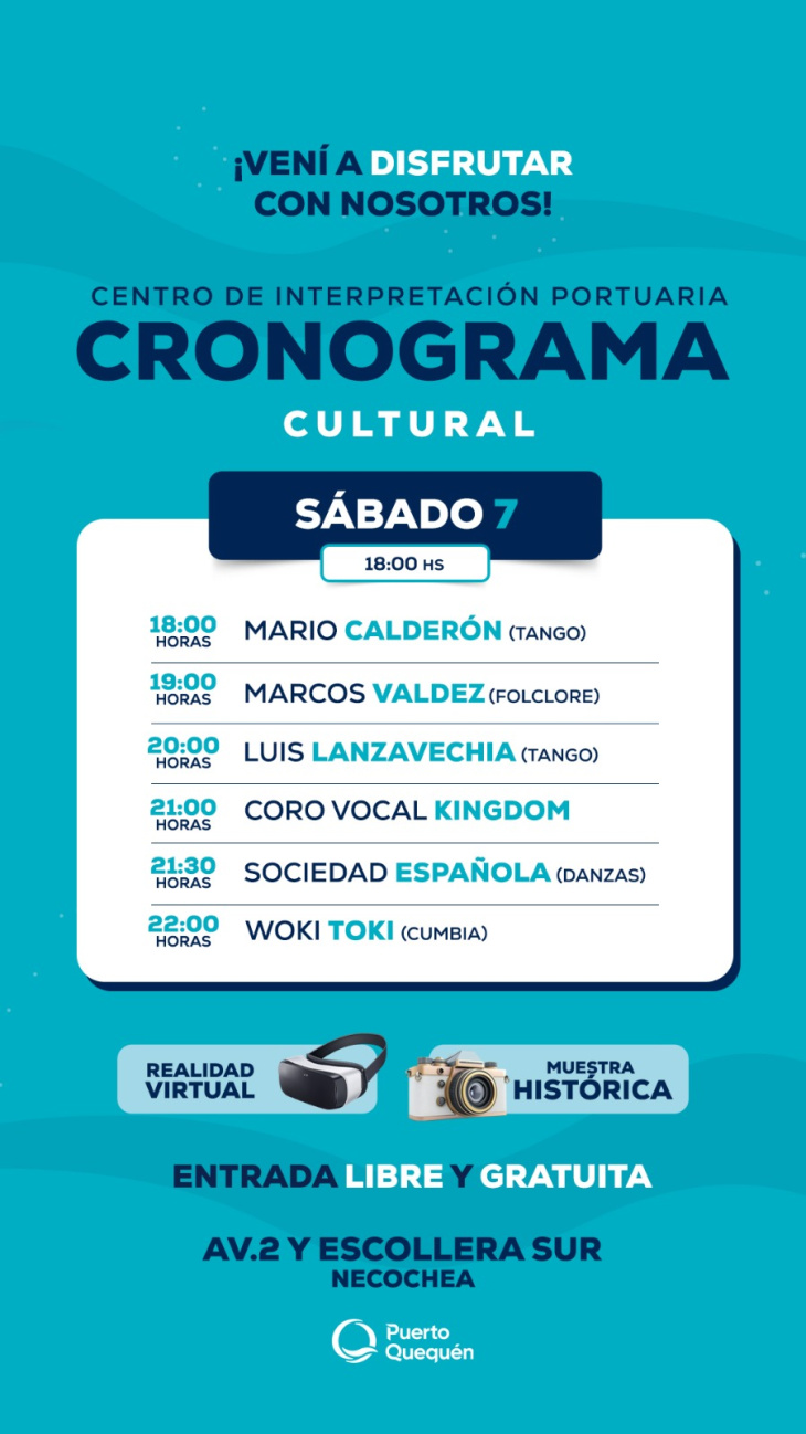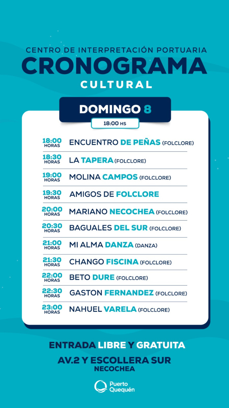El Puerto Quequén, a través del Centro de Interpretación Portuaria, invita a la comunidad a disfrutar de un fin de semana cargado de actividades culturales, que se desarrollarán entre el viernes 6 y el domingo 8 de febrero en el predio ubicado en el acceso de la Escollera Sur, con entrada libre y gratuita.