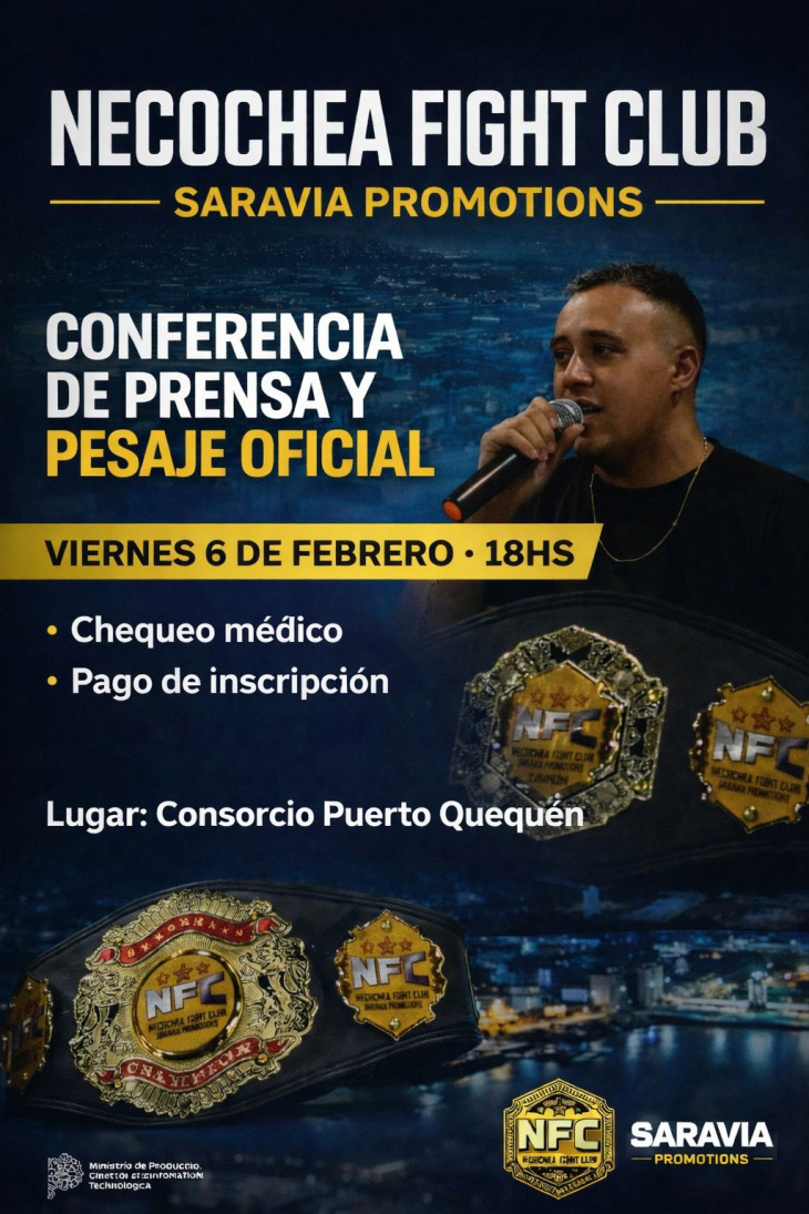 Este viernes 6 de febrero, desde las 18, se realizará la conferencia de prensa y el pesaje oficial del Necochea Fight Club, un evento organizado por Saravia Promotions que se presenta como uno de los espectáculos de deportes de combate más importantes de la región.