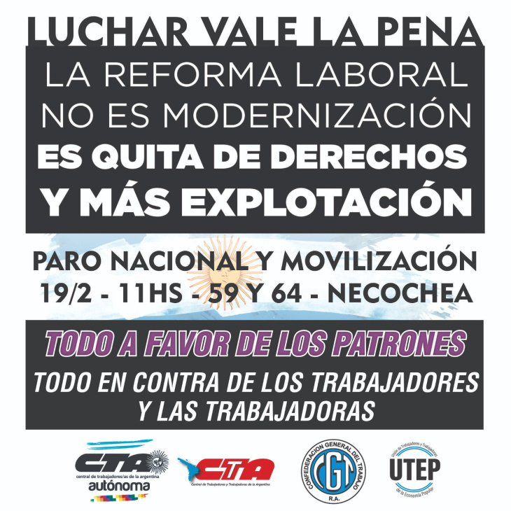 En el marco de la jornada, las centrales sindicales difundieron una convocatoria bajo la consigna: “Luchar vale la pena. La reforma laboral no es modernización, es quita de derechos y más explotación”. Además del paro, se anunció una movilización en Necochea a las 11 de la mañana en la esquina de 59 y 64. La convocatoria lleva la firma de la CTA Autónoma, la CTA de los Trabajadores, la CGT y la UTEP, quienes sostienen que el proyecto en debate “beneficia a los sectores patronales en detrimento de los derechos de trabajadores y trabajadoras”.
