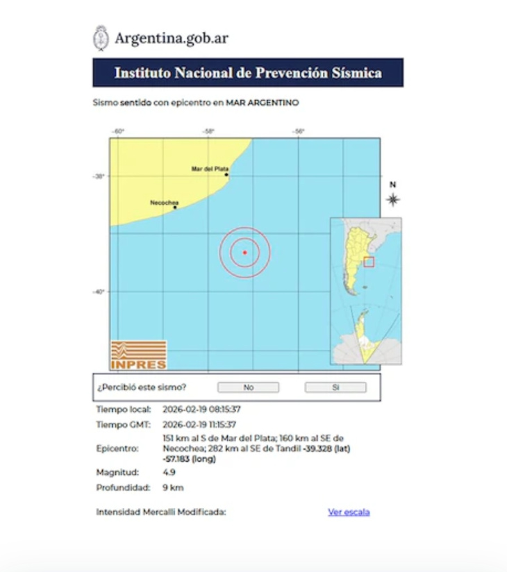 Según informó el Instituto Nacional de Prevención Sísmica (INPRES), el movimiento ocurrió alrededor de las 8:15, con epicentro en el Mar Argentino, a más de 150 kilómetros de Mar del Plata y a una profundidad aproximada de 9 kilómetros.