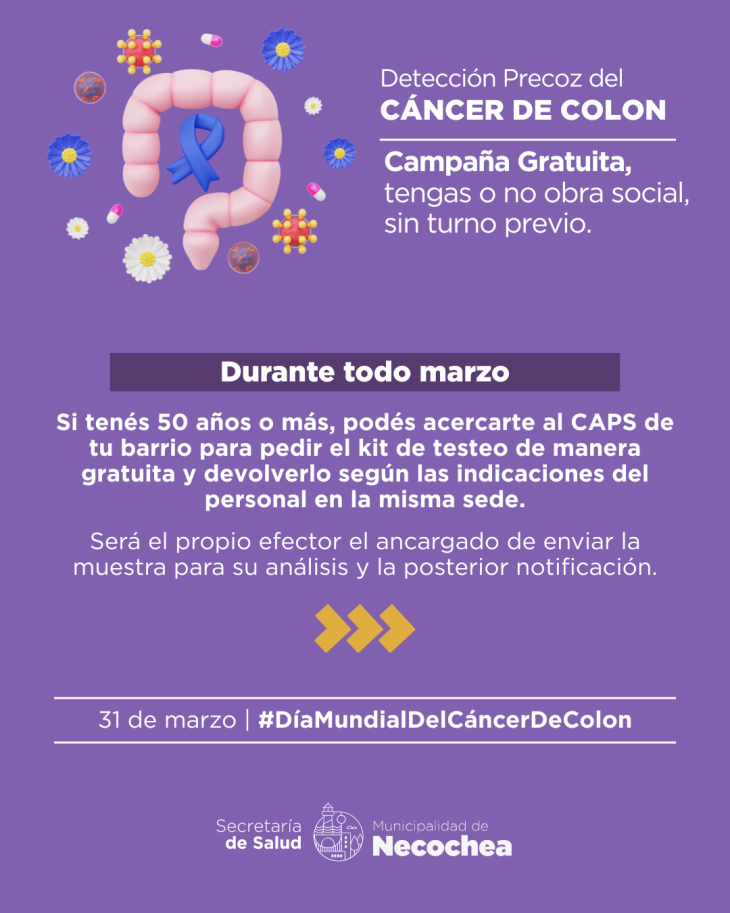 Desde APS, cuya dirección está a cargo de Carina Mazeris, explicaron que “si tenés 50 años o más vas a poder acercar tu muestra para realizar el test de sangre oculta en heces. La recolección se debe realizar en un frasco de plástico seco y limpio y acercarla al CAPS de tu barrio”.