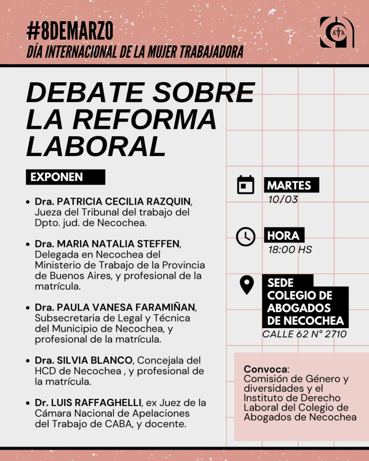 En el marco del Día Internacional de la Mujer Trabajadora, el Colegio de Abogados de Necochea realizará un encuentro de debate sobre la reforma laboral y sus posibles efectos en el mundo del trabajo y en el ejercicio profesional de la abogacía.
