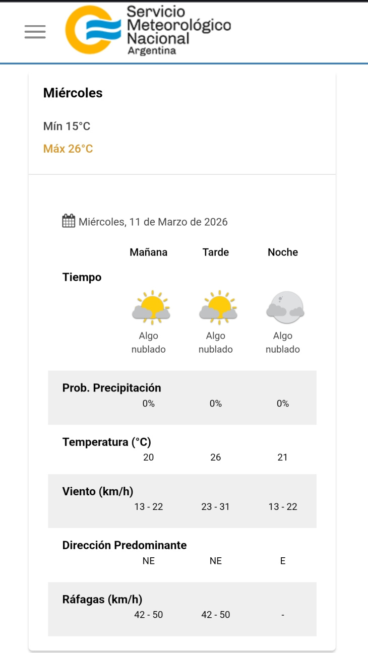 Durante la mañana, la temperatura se ubicará alrededor de los 20°C, con viento del noreste entre 13 y 22 km/h. En este período se prevén ráfagas que podrían alcanzar entre 42 y 50 km/h.