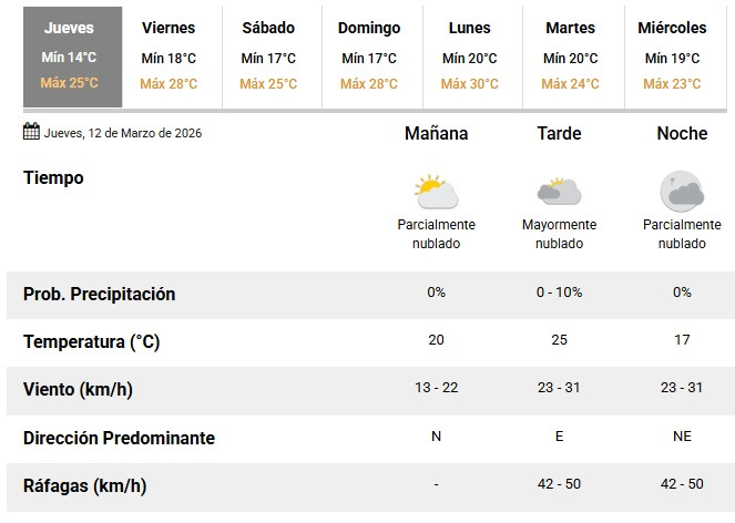 Por la noche, el cielo volverá a presentarse parcialmente nublado, con una temperatura que descenderá hasta los 17°C. El viento continuará soplando del sector noreste, con velocidades entre 23 y 31 km/h y ráfagas de hasta 50 km/h.