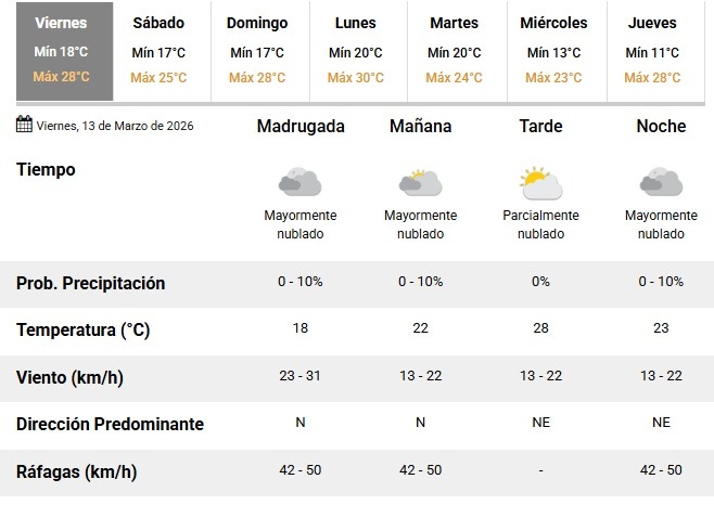 Por la mañana, las condiciones se mantendrán similares, con 22 grados de temperatura y viento del norte entre 13 y 22 km/h, también con ráfagas de hasta 50 km/h.