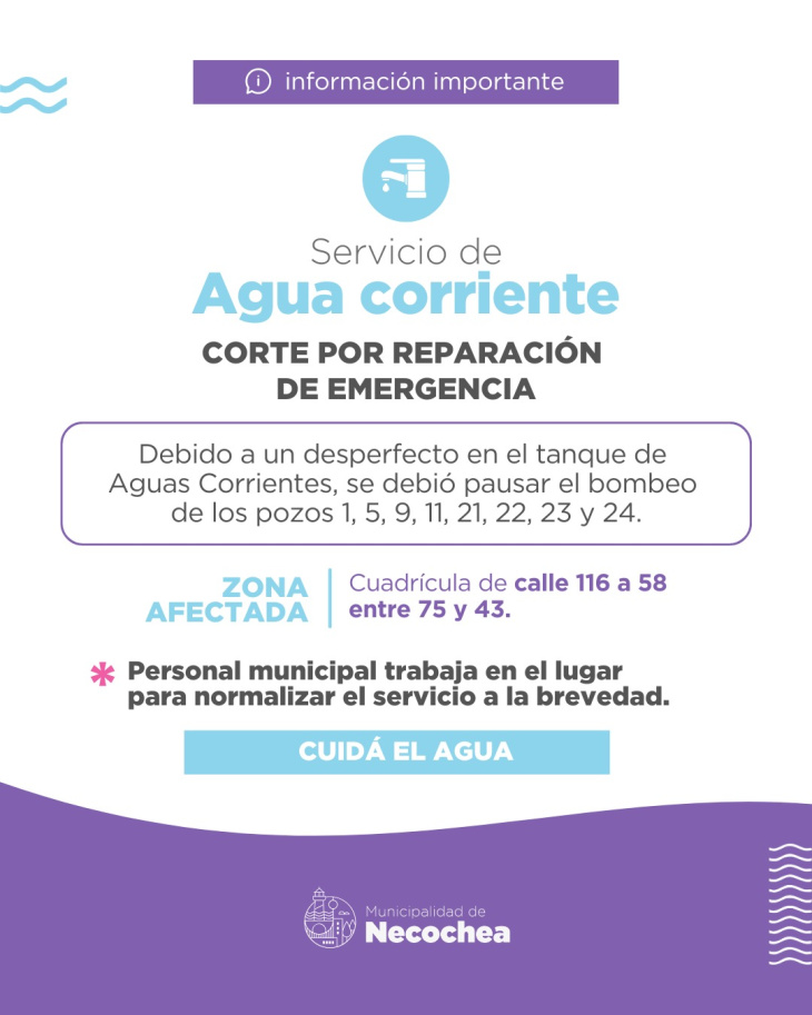 Desde el municipio solicitaron a la comunidad hacer un uso responsable del agua disponible, priorizando el consumo esencial hasta tanto se normalice la situación.