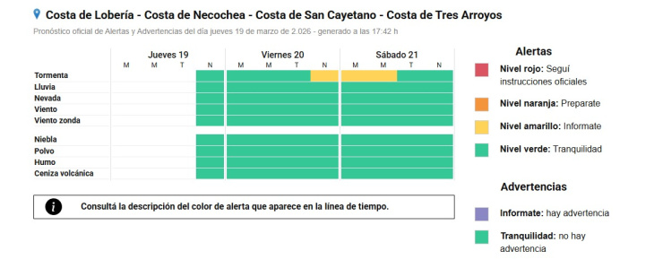 El Servicio Meteorológico Nacional emitió una alerta amarilla por tormentas para la región costera, que incluye Necochea, Lobería, San Cayetano y Tres Arroyos.